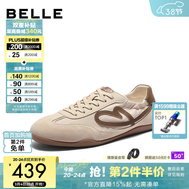 百丽复古撞色德训鞋男2026新款夏季舒适潮搭透气休闲板鞋A2432BM6预售 杏/灰/棕 43
