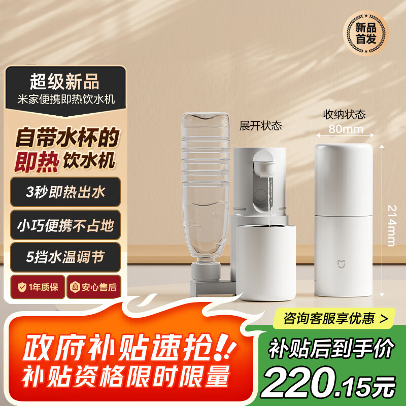 米家小米即热式饮水机 便携即热烧水壶保温杯 出差旅行电热水壶冲奶泡奶桌面家用小型迷你白色