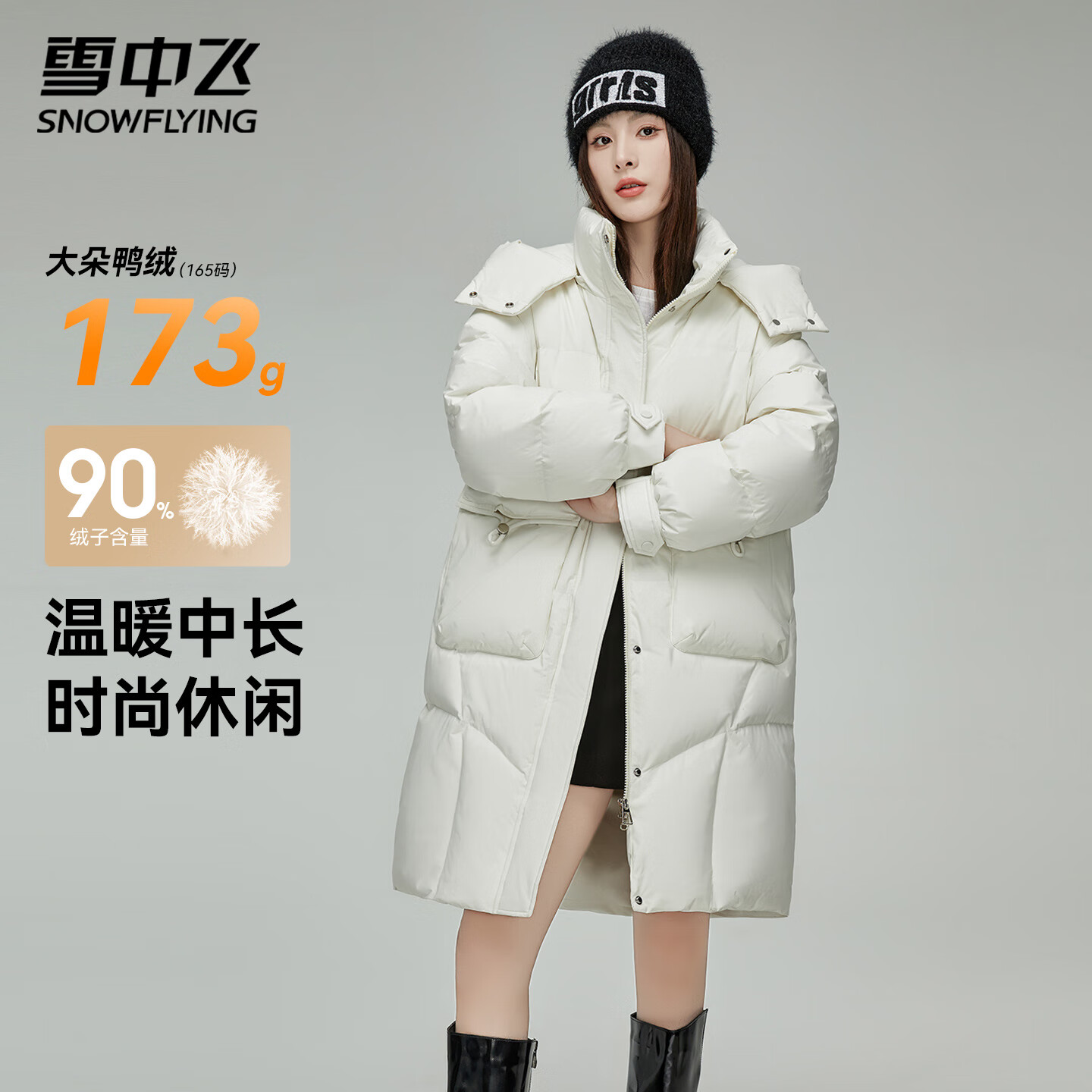 雪中飞时尚羽绒服女士冬季长款温暖羽绒衣翻盖口袋上衣简约纯色百搭外套 米白 S (155)