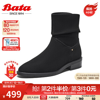 Bata时装靴女2023冬商场新款百搭牛皮粗跟褶皱软底堆堆靴AXG60DD3 黑色 35