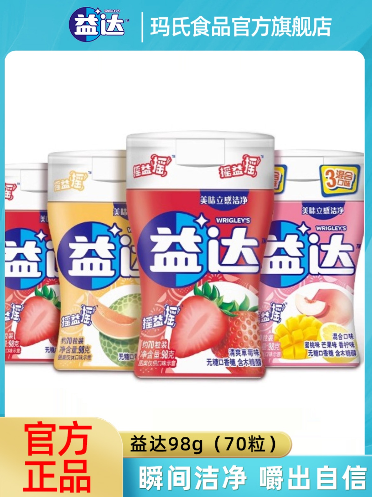 益达口香糖无糖木糖醇约70粒大瓶装草莓蜜瓜混合糖果清新口气零食
