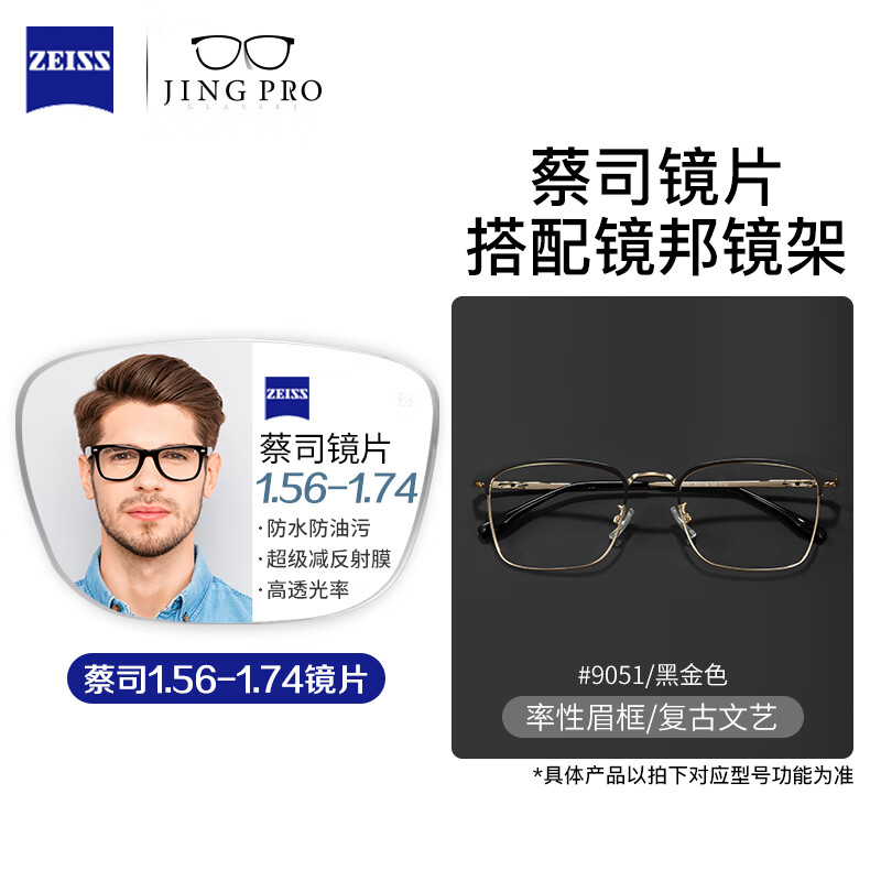 蔡司系列高清防水防污耐磨防刮镜片可配镜架TK1 9051黑金 配蔡司旗下视特耐1.67超薄非球面