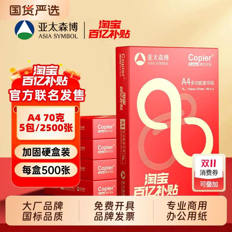 【官方联名款】亚太森博A4打印纸整箱500张一包70g80g拷贝可乐复印纸白纸学习用纸画画纸草稿纸办公用纸批发
