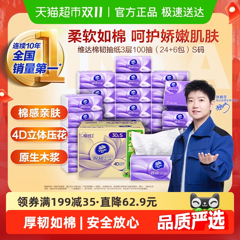 【孙颖莎推荐】维达棉韧压花抽纸3层S码家用纸巾实惠整箱装