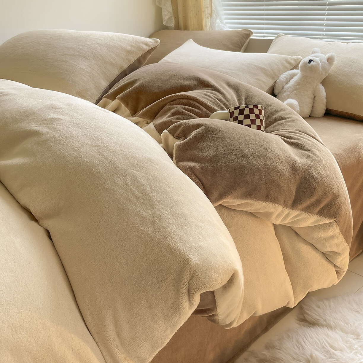 J.H.Longess 厚实保暖纯色双拼牛奶绒高克重秋冬加绒床上四件套 米杏+茶咖/LJR 1.8床 床单款 (被套200*230cm) 套件
