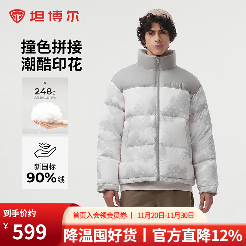 坦博尔2025冬季新款时尚潮流百搭休闲立领拼接撞色面包服短款厚羽绒服男 山云灰 M (165)