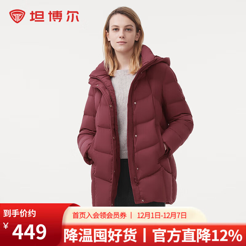 坦博尔2025冬季新款休闲百搭可脱卸帽羽绒服女加厚短款妈妈装新年红560D 蝶羽红 L