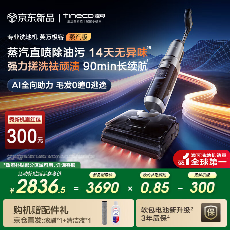 添可芙万极客蒸汽版全向助力洗地机【140℃蒸汽除油污 90min续航】0缠毛躺平吸拖一体拖地扫地机器人