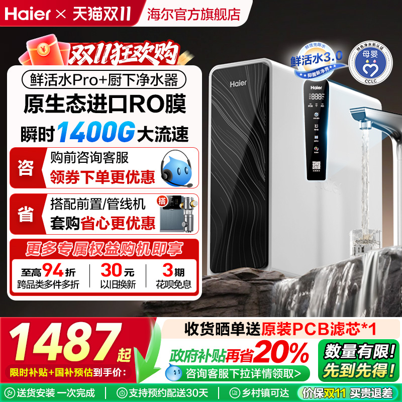 【政府补贴】海尔鲜活水pro+1200G净水器家用直饮厨卫净饮机R881