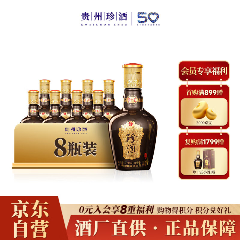 珍酒 珍十五小酒 53度 酱香型白酒 125ml*8 8瓶 带盒装