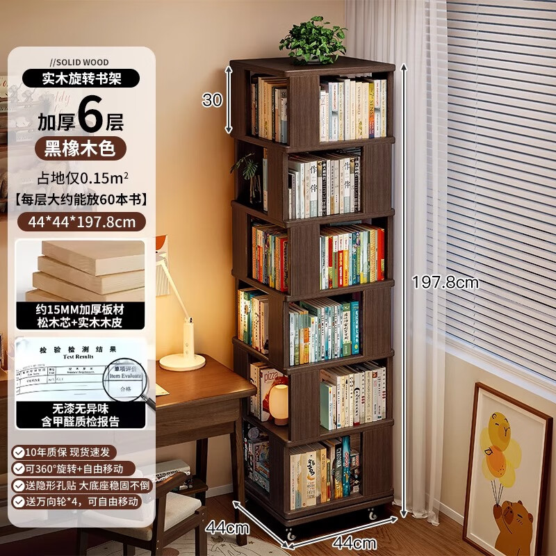 林之语旋转书架360度实木书柜置物架落地一体靠墙可移动转角儿童小窄柜 【方款六层】44*197.8CM黑橡木色