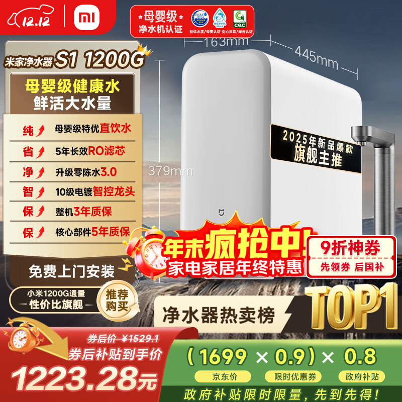米家【10周年新品】小米净水器S1 1200G家用大通量5年长效RO反渗透过滤直饮净饮一体净水机 MR1272-A