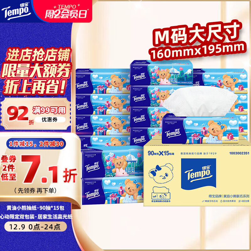 得宝(TEMPO)抽纸 黄油小熊心动限定款 4层90抽*15包 抽取式面巾纸 餐巾纸