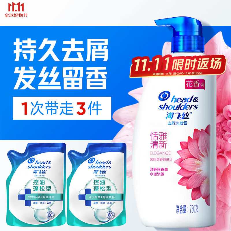 海飞丝香氛洗发水持久去屑秀发留香去屑止痒控油洗头膏 恬雅清新型750G+补充装200*2