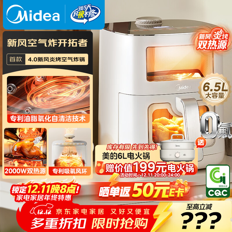 美的(Midea)新风炎烤空气炸锅0氟涂层2025年新款免翻面 家用大容量6.5L 可视大视窗空气炸锅蒸烤一体 KZC6521
