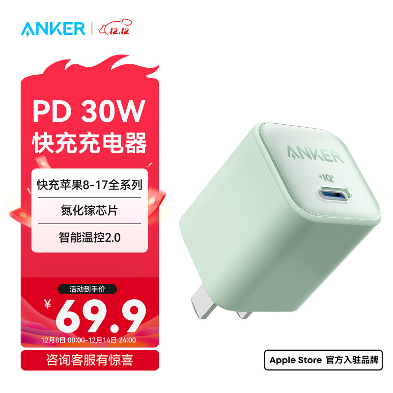 ANKER安克30W安心充【热销100W+】PD快充氮化镓充电器适用iPhone苹果1716华为安卓充电头套装插脚可折叠 自然青-30W氮化镓-低温快6倍