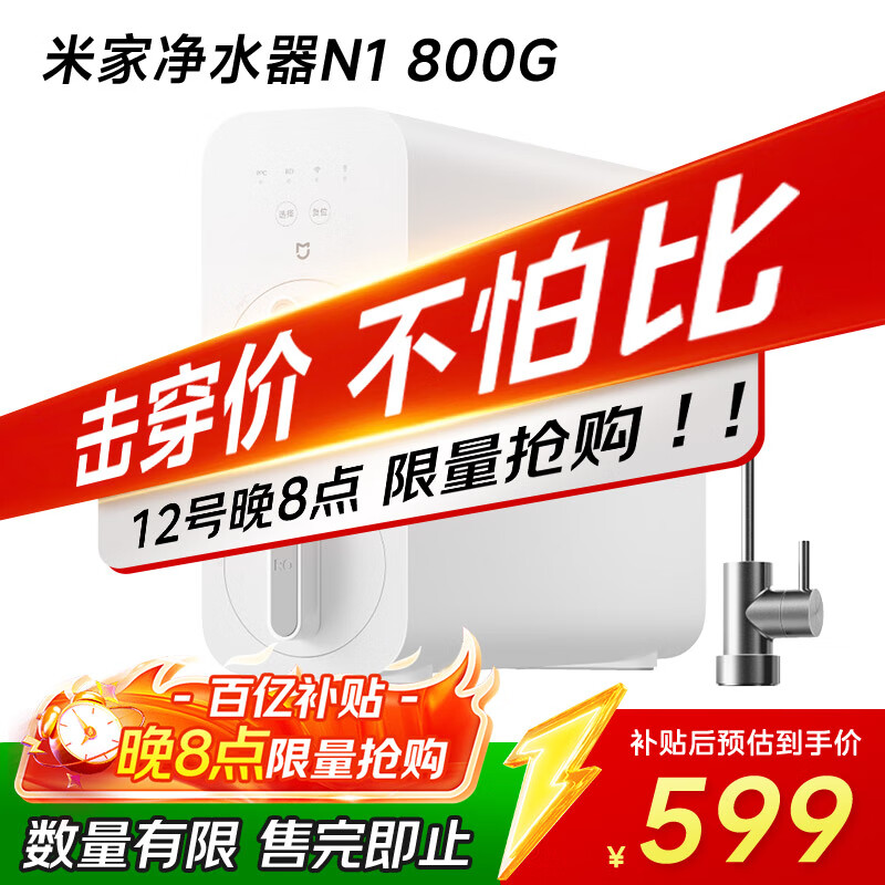 米家小米净水器N1 800G大通量 母婴级净水认证 厨房台下家用 5年RO反渗透 小米发布会MR872