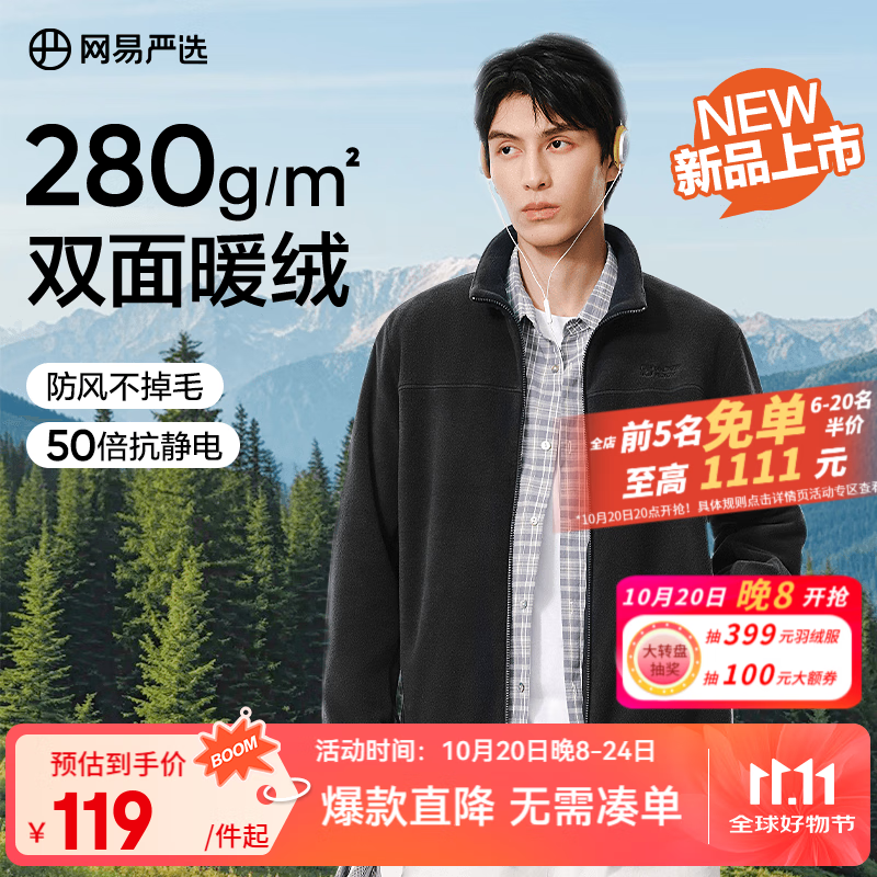 旗舰店网易严选25新品摇粒绒外套男士夹克冲锋衣内胆夹克蓄热保暖抓绒衣户外休闲 A款25秋冬克重升级-幻影黑 L
