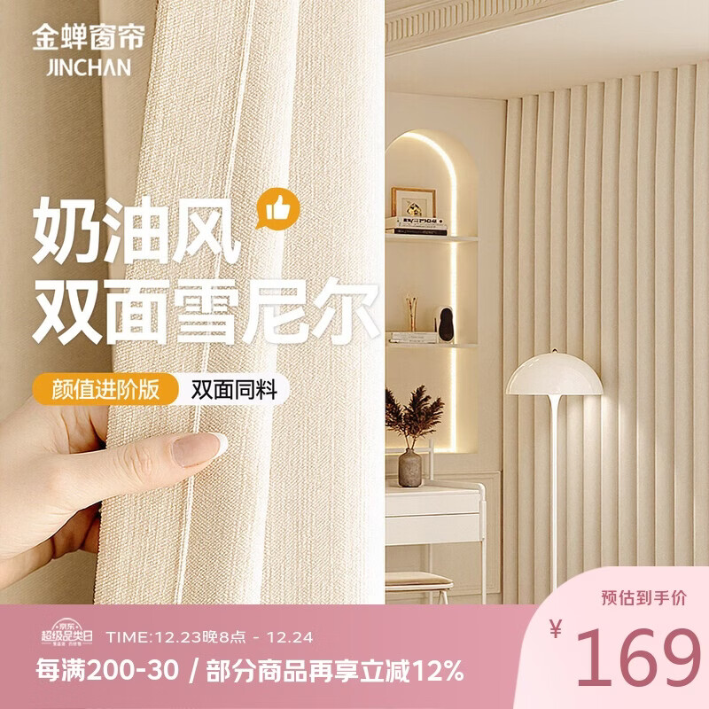 自营金蝉窗帘家用遮光客厅卧室双面雪尼尔高遮光窗帘挂钩式 奶油色270*270