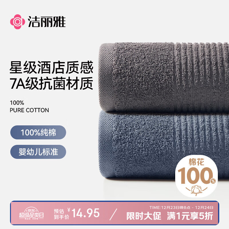 自营洁丽雅毛巾 纯棉全棉100%洗脸毛巾不易掉毛7A级抗菌柔软男士洗澡 2条