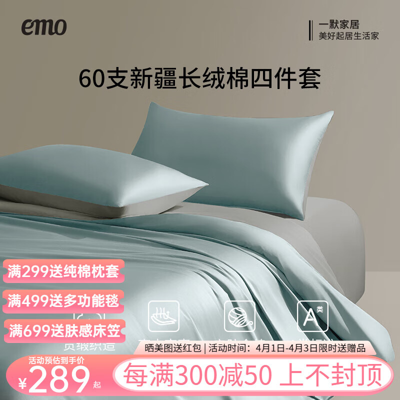 旗舰店一默四件套纯棉60支长绒棉贡缎100%A类床单枕套单双人家纺床上四件套 雾蓝配月灰 被套200*230cm丨床单+枕套*2