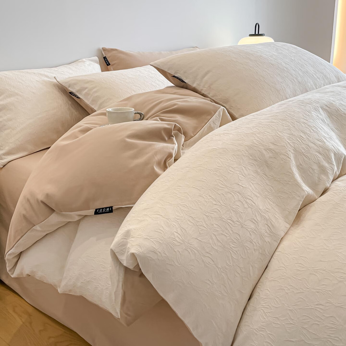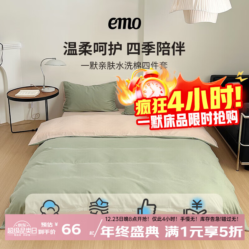 旗舰店一默四件套被套床单枕套简约纯色水洗棉居家宿舍家纺亲肤透气床品套装 卡其+抹茶绿 床单款 (被套200*230cm)