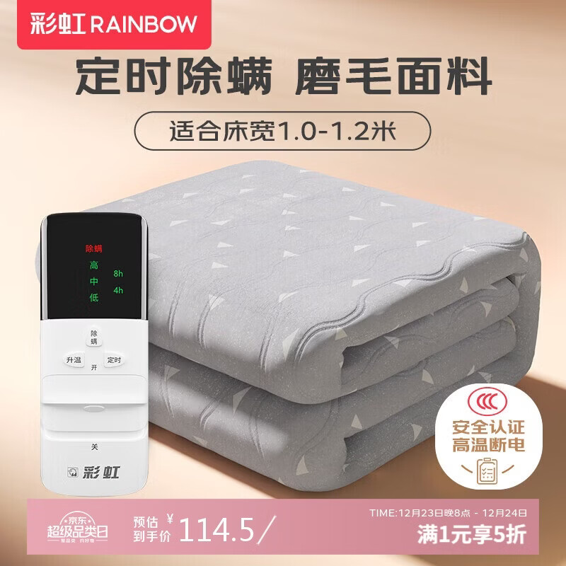 自营彩虹【高温断电】单人智能定时除螨磨毛电热毯电褥子1.8*1.0米
