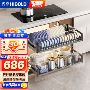 旗舰店悍高(HIGOLD) 厨房橱柜拉篮碗架抽屉式碗篮加厚304不锈钢底板调味篮双层碗碟篮 800柜2层-L系列套装