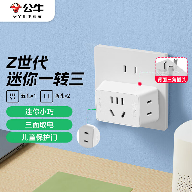 自营公牛(BULL)一转三插座/转换插头/电源转换器 3位无线转换插座 GN-ZA221
