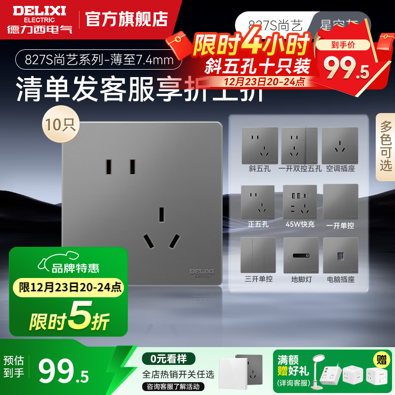 旗舰店德力西(DELIXI)开关插座面板CD827S星空灰斜五孔插座86型家用空调插座暗装开关 斜五孔10只【清单优先发货】