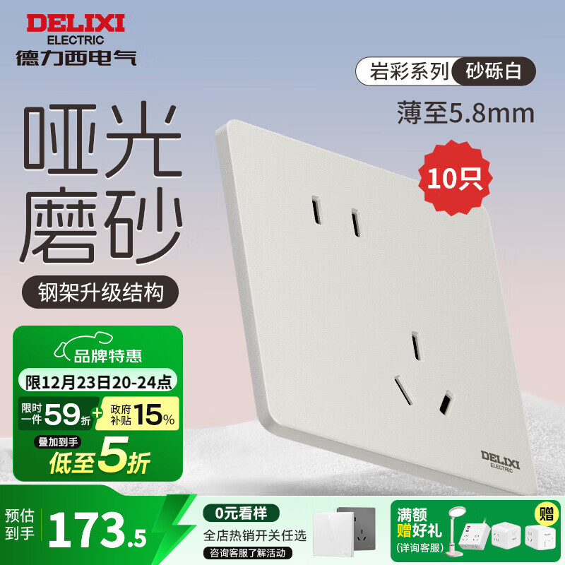 旗舰店德力西(DELIXI)开关插座面板超薄哑光磨砂暗装5孔插座奶油风砂砾白无框大板 岩彩 斜五孔插座10只装