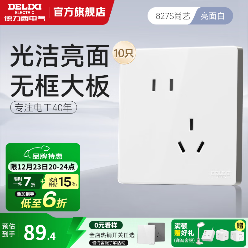 旗舰店德力西(DELIXI) 开关插座面板CD827S瓷感白色五孔无框大板86型一开墙壁usb插座 斜五孔插座10只装