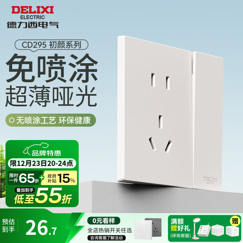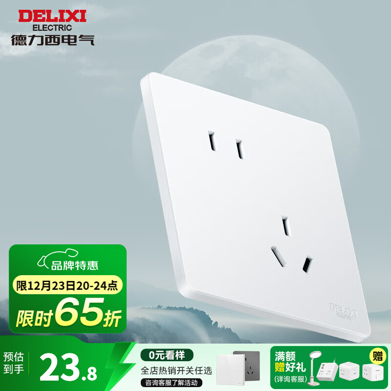 旗舰店德力西(DELIXI)开关面板86型3.8MM超薄哑光面板无框墙壁电源插座 898悦彩 云雾白 斜五孔插座
