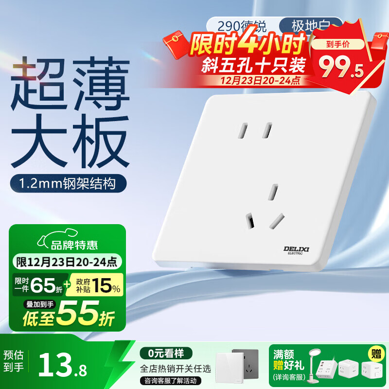 旗舰店德力西(DELIXI) 开关插座面板超薄钢架86型暗装电源CD290极地白色无框大板套餐 斜五孔插座