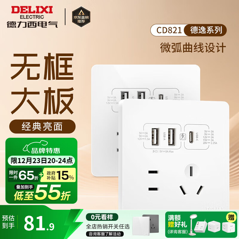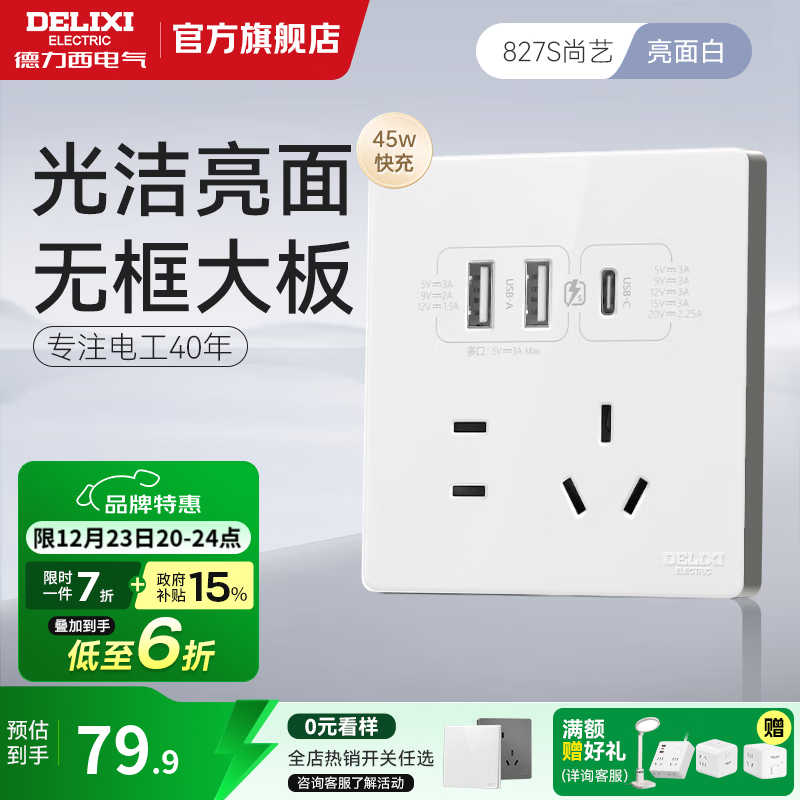旗舰店德力西(DELIXI) 开关插座面板CD827S瓷感白色五孔无框大板86型一开墙壁usb插座 【45W】双USB五孔+Type-c