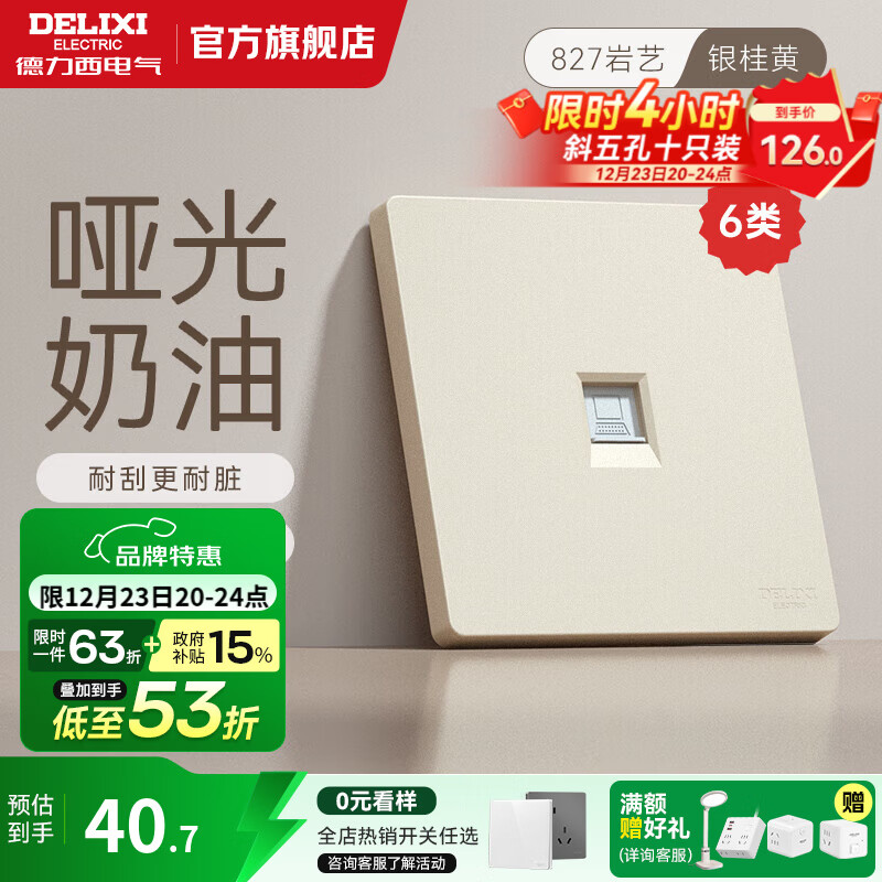 旗舰店德力西(DELIXI)开关插座面板 哑光磨砂环保 奶油风大板86型USB插座 827银桂黄 网络插座(六类)