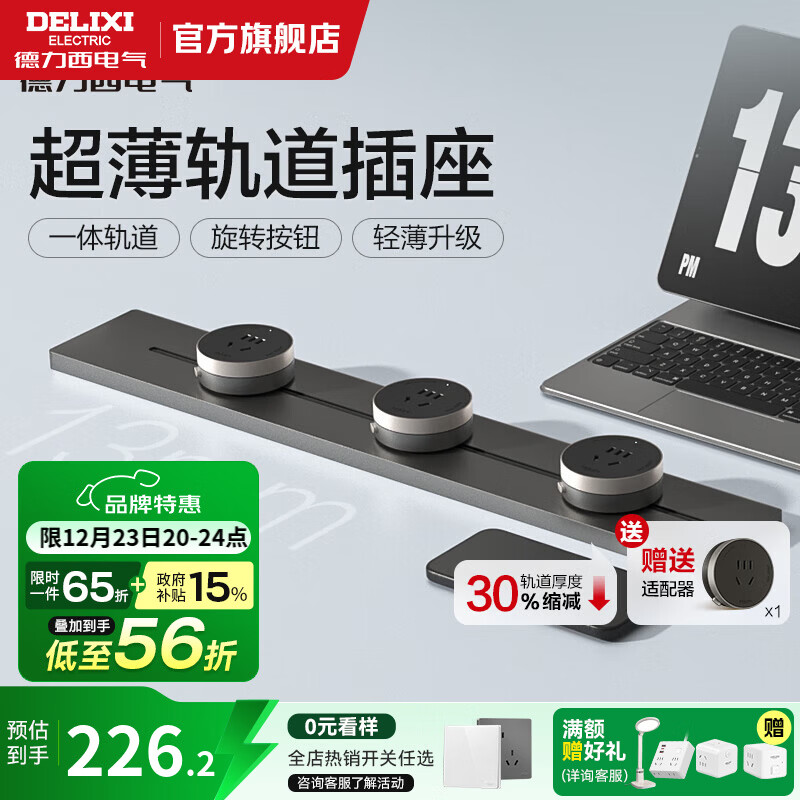 旗舰店德力西【全新升级】超薄轨道插座可移动明装8000W大功率插线板厨房导台 【超薄云界丨铝轨+童锁】灰色50cm+3