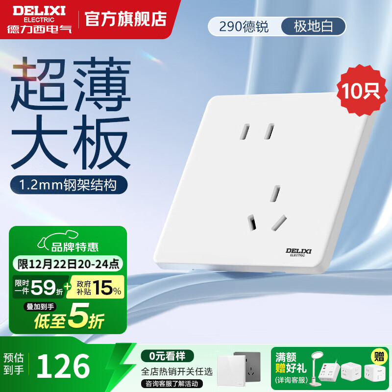 旗舰店德力西(DELIXI) 开关插座面板超薄钢架86型暗装电源CD290极地白色无框大板套餐 斜五孔插座10只装