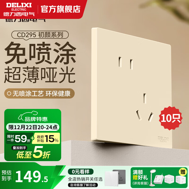 旗舰店德力西(DELIXI)开关插座面板 哑光磨砂大板家用86型超薄墙壁电源开关CD295银桂黄 斜五孔插座10只装(优先发货)