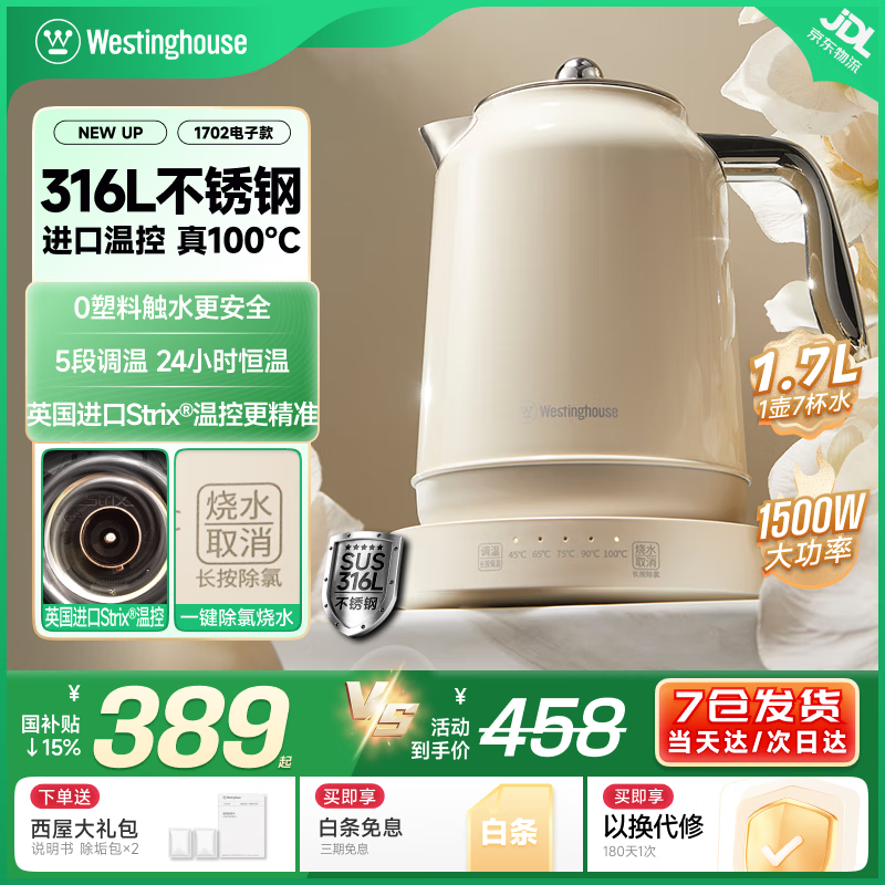 百亿补贴西屋电热水壶家用1.7L大容量恒温开水壶一键除氯316L不锈钢内胆烧水壶 1.7L 【电子款】5段温控+24小时恒温+一键除氯