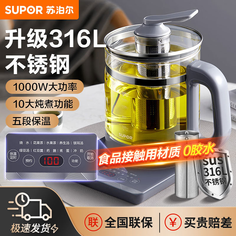 旗舰店苏泊尔养生壶1.5L家用炖煮多功能加厚玻璃全自动保温预约煮茶器