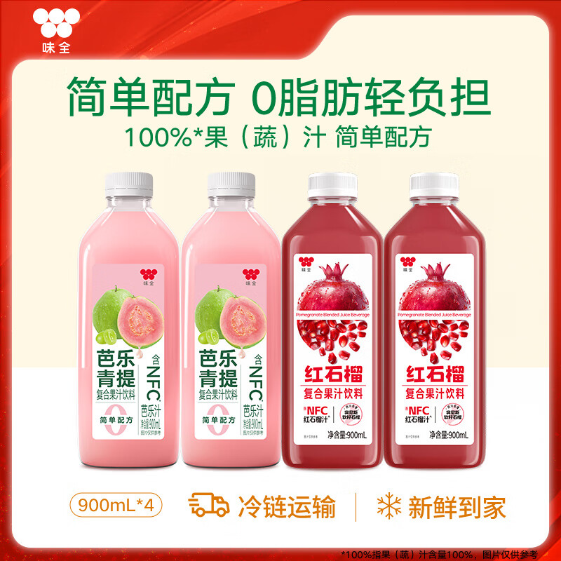 旗舰店味全每日C果汁900ml饮料复合果蔬汁冷藏饮料家庭装分享4瓶送礼品聚会 芭乐青提900ml*2+石榴汁900ml*2