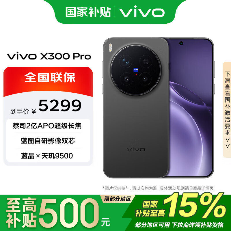 自营vivo X300 Pro 12+256G 纯粹黑 蓝晶x天玑9500 6510mAh蓝海电池 蔡司2亿APO超级长焦 手机【移动补贴】