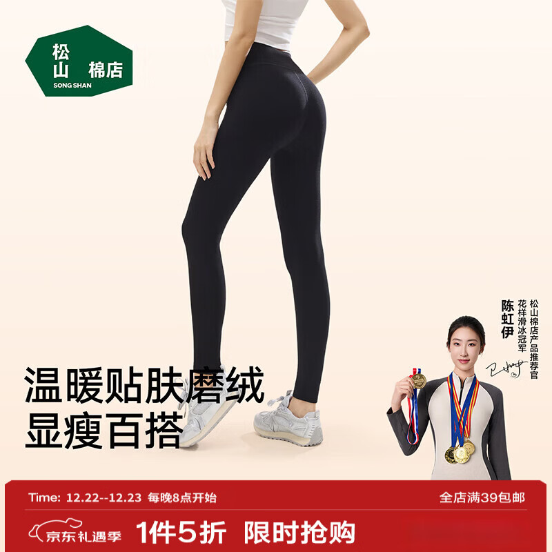 旗舰店松山棉店保暖打底裤女士可外穿弹力舒适显瘦黑色瑜伽裤秋冬加厚加绒秋裤子 黑色 均码 (推荐95-130斤)