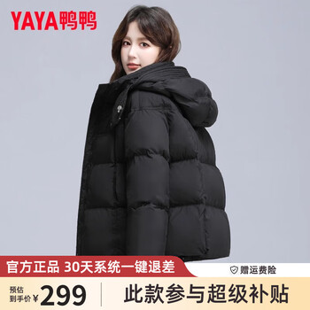 旗舰店鸭鸭秋冬新品短款羽绒服女加厚立领连帽面包服宽松保暖鸭绒外套潮 黑色 M