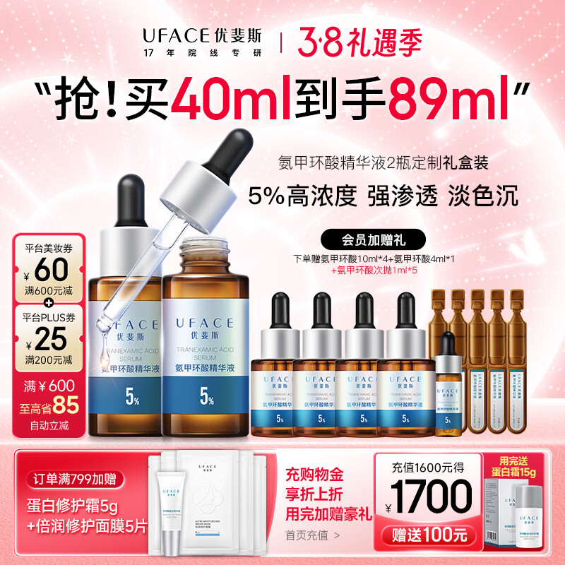 旗舰店优斐斯(uface)氨甲环酸精华液传明酸5%浓度提亮肤色淡化色沉补水三八节女神礼物 20ml*2瓶 【送40ml】