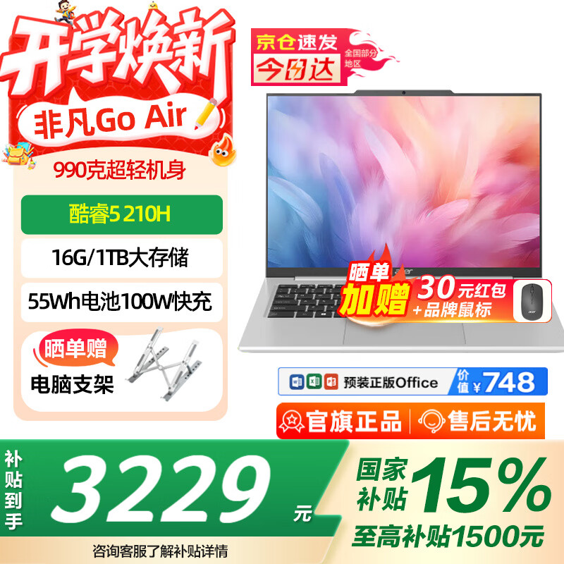 旗舰店宏碁非凡Go Air超轻薄笔记本小于1kg镁铝机身设计学生游戏商务办公酷睿标压14英寸S14 Core5 210H 16G 1T