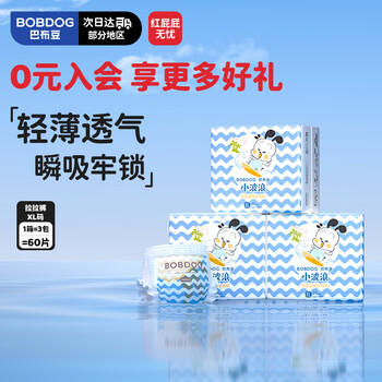 自营巴布豆(BOBDOG)小波浪薄柔亲肤拉拉裤XL60片(12-17KG)加大码婴儿尿不湿