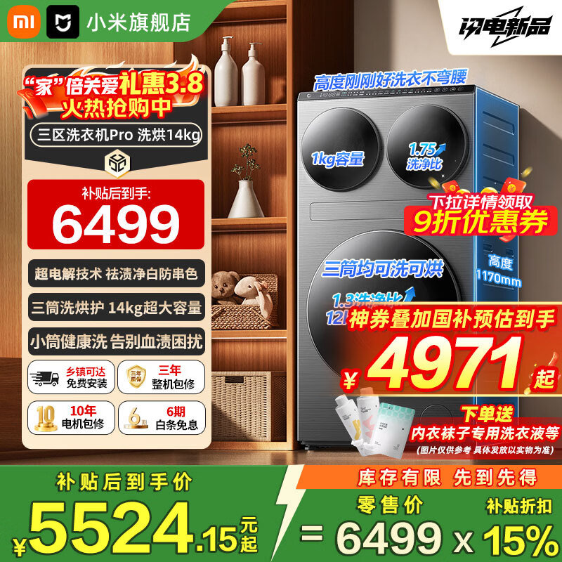旗舰店小米(MI)米家【新品首发】14公斤大容量三筒洗洗烘一体超电解技术1.75高洗净比内衣袜子柔烘高温除菌洗衣机 14kg丨超电解技术丨四路独立投放 三筒