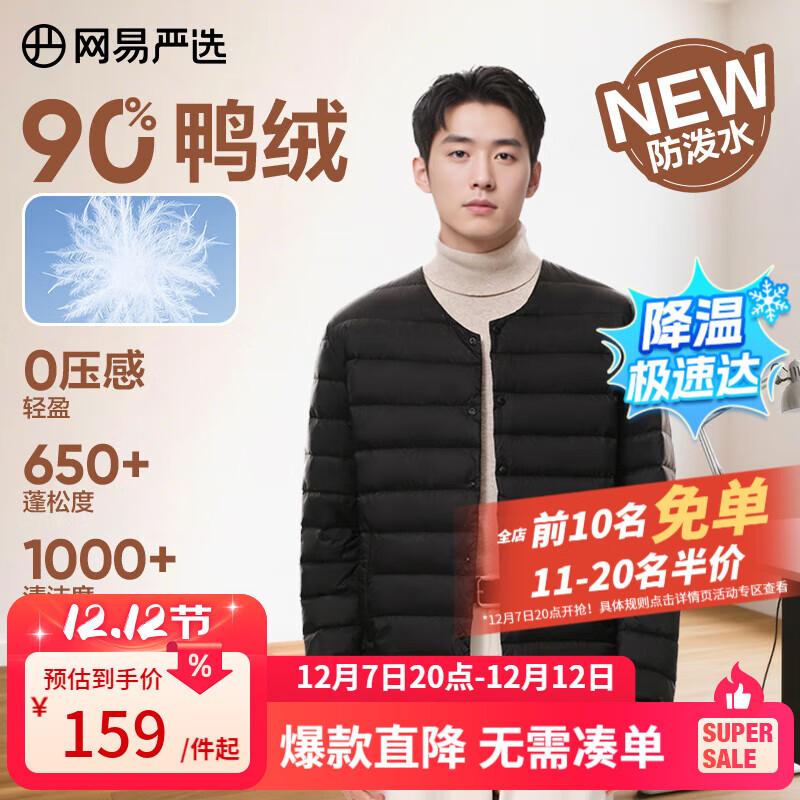百亿补贴网易严选25新品90鸭绒轻暖羽绒服保暖0压感防泼水蓄热抗菌外套男羽绒内胆 A款-25秋冬-水墨黑-无领 M